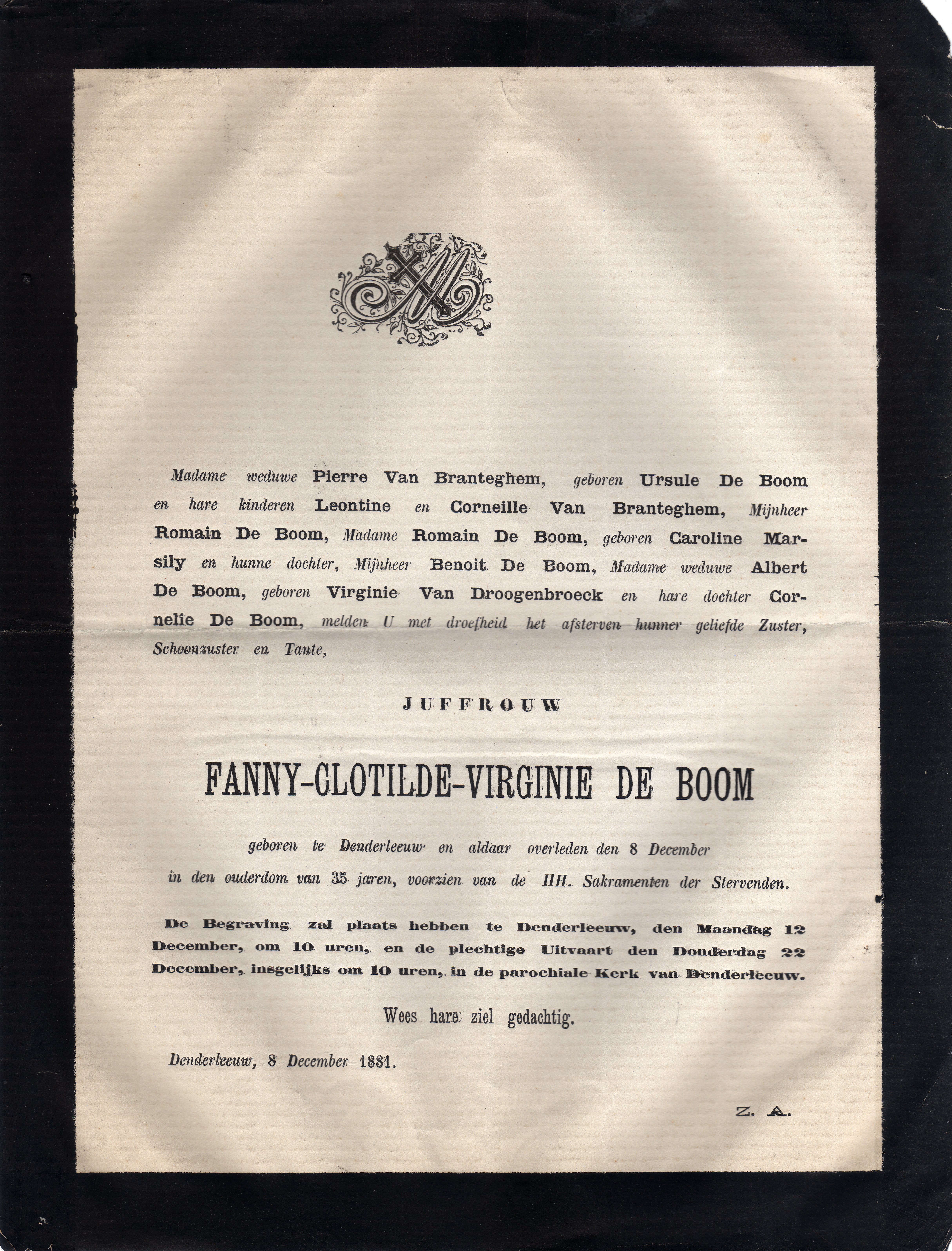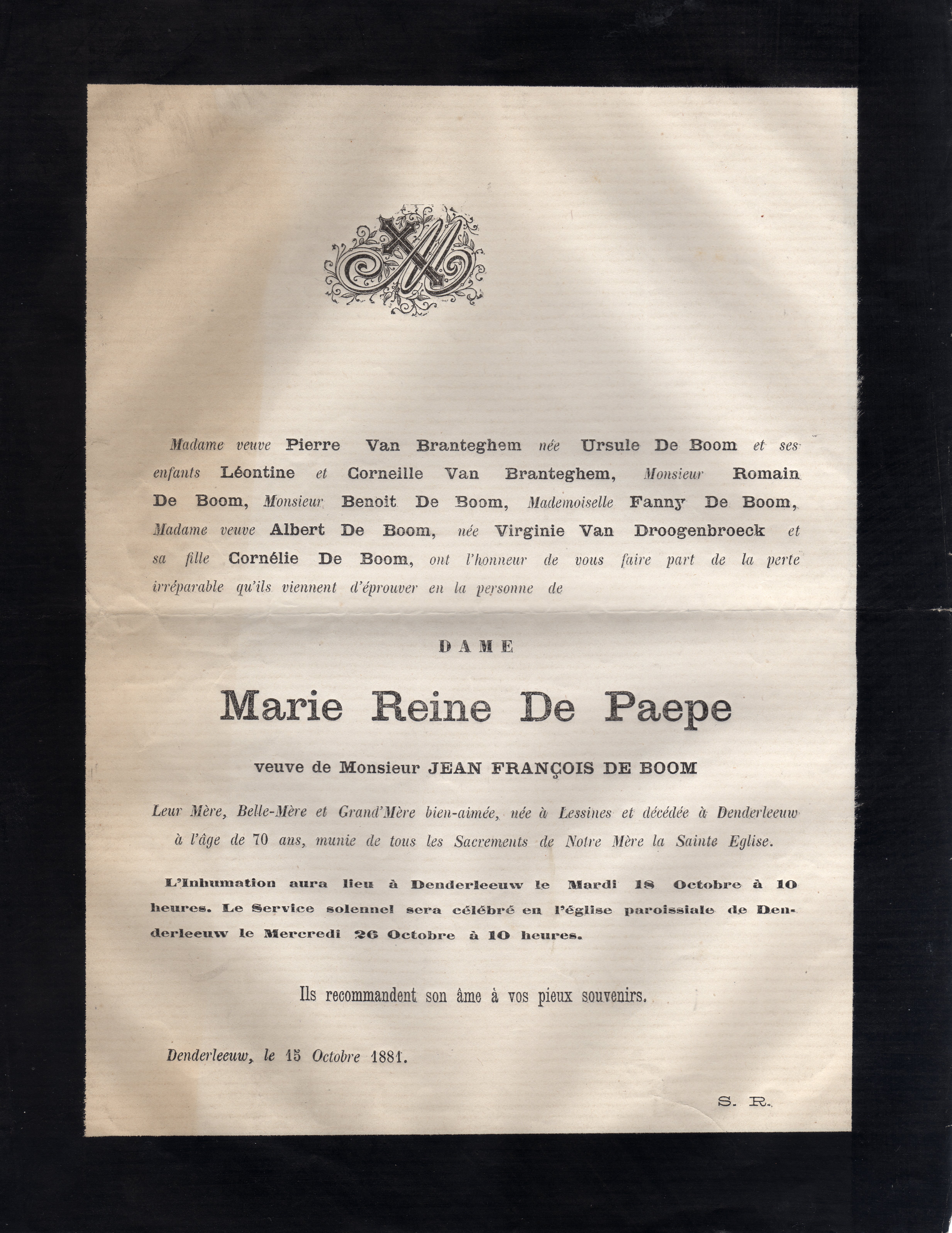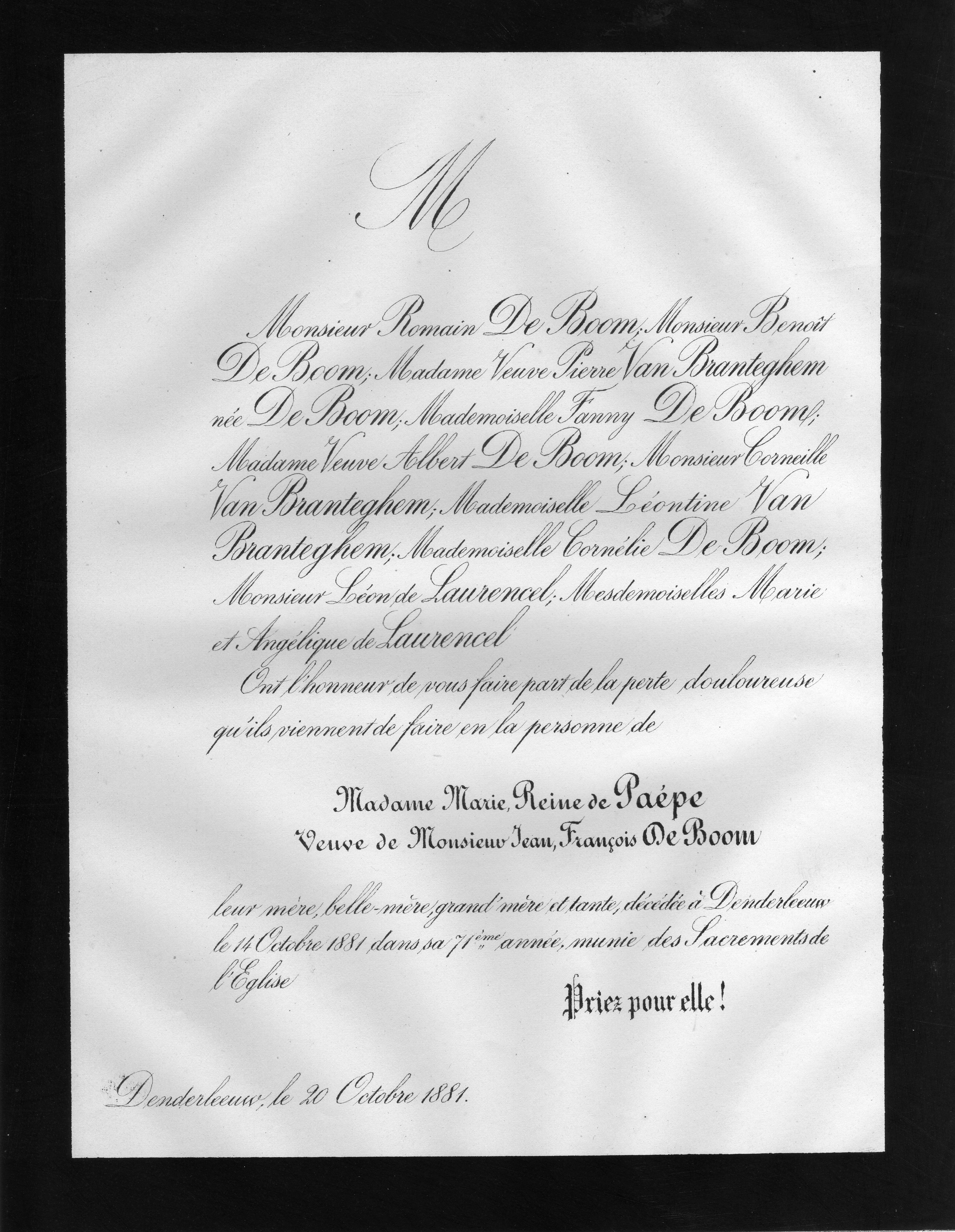 1848 Jean Francois De Boom; 1879 Daniel van Santen; 1881 Marie Reine de Paepe (two notices!); 1881 Fanny Clotilde Virginie De Boom, 1883 Josephine Vertongen van Branteghmen.