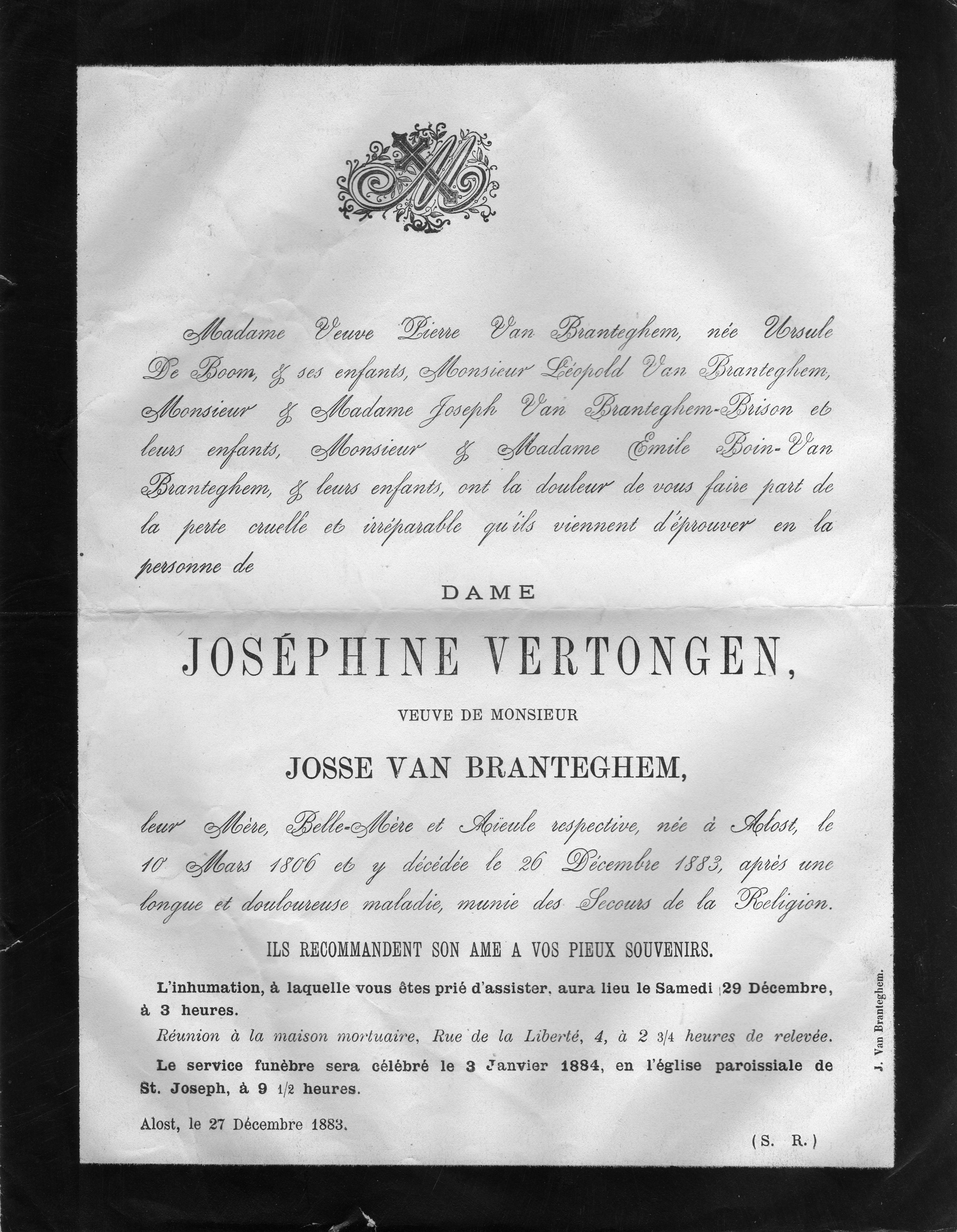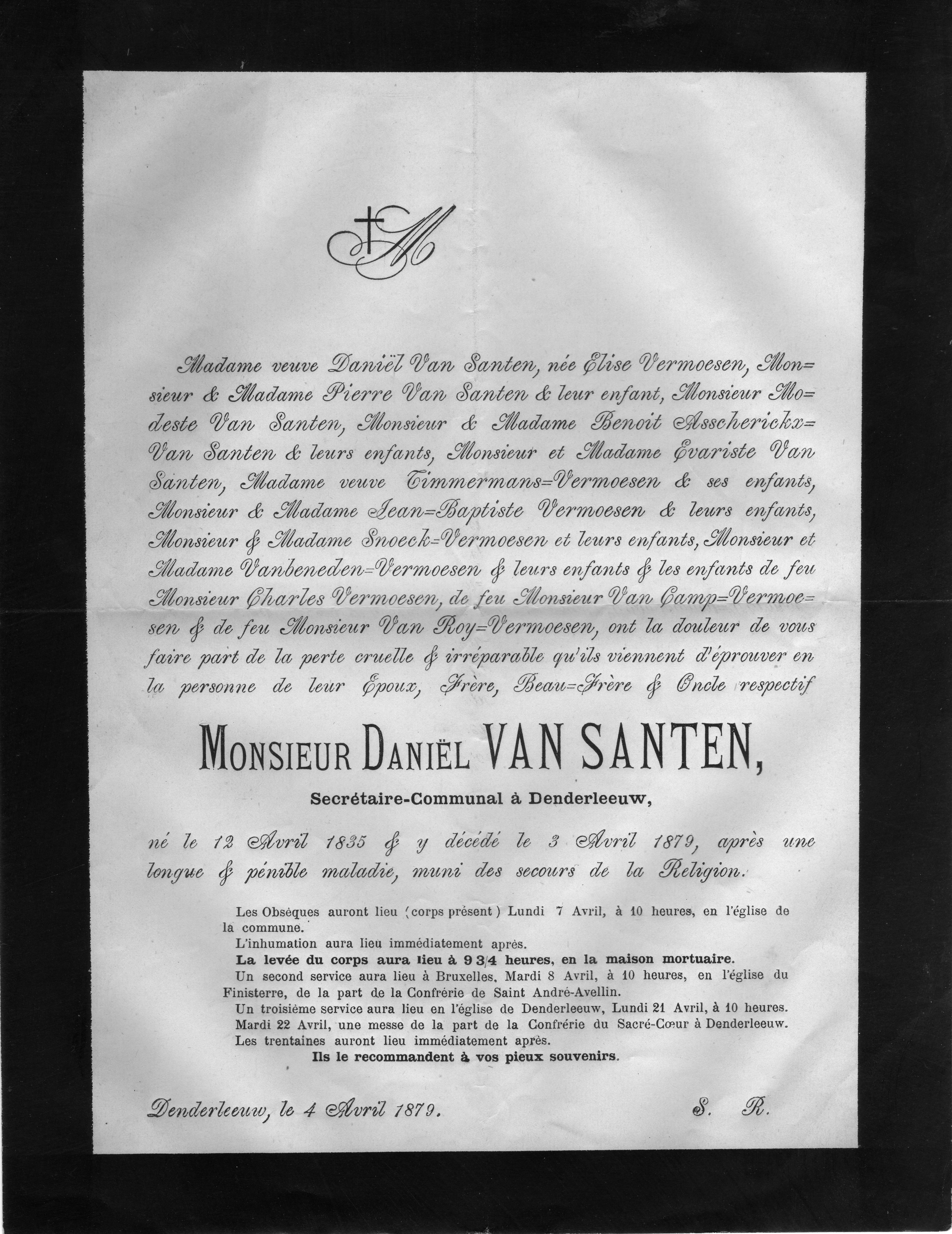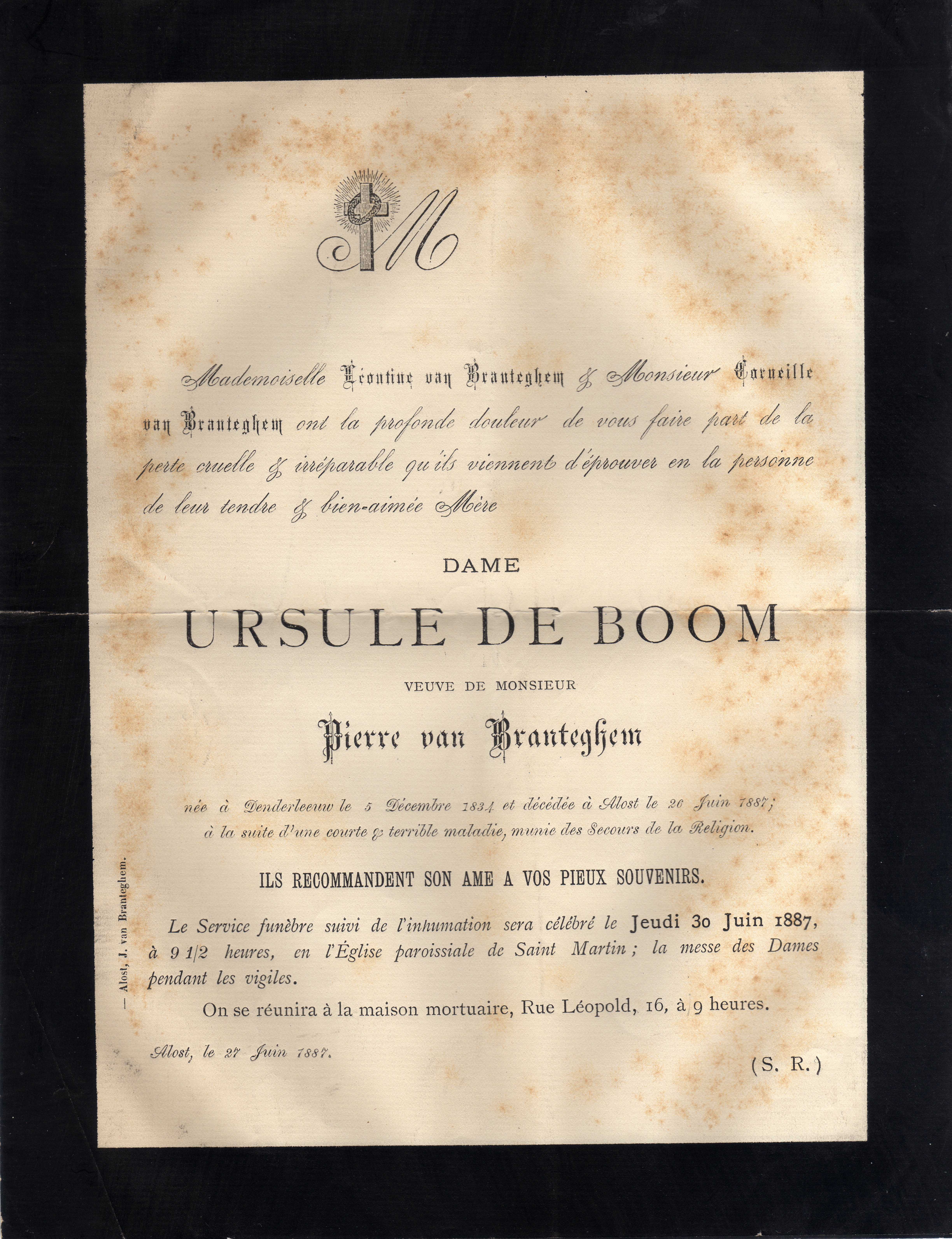 1848 Jean Francois De Boom; 1879 Daniel van Santen; 1881 Marie Reine de Paepe (two notices!); 1881 Fanny Clotilde Virginie De Boom, 1883 Josephine Vertongen van Branteghmen.