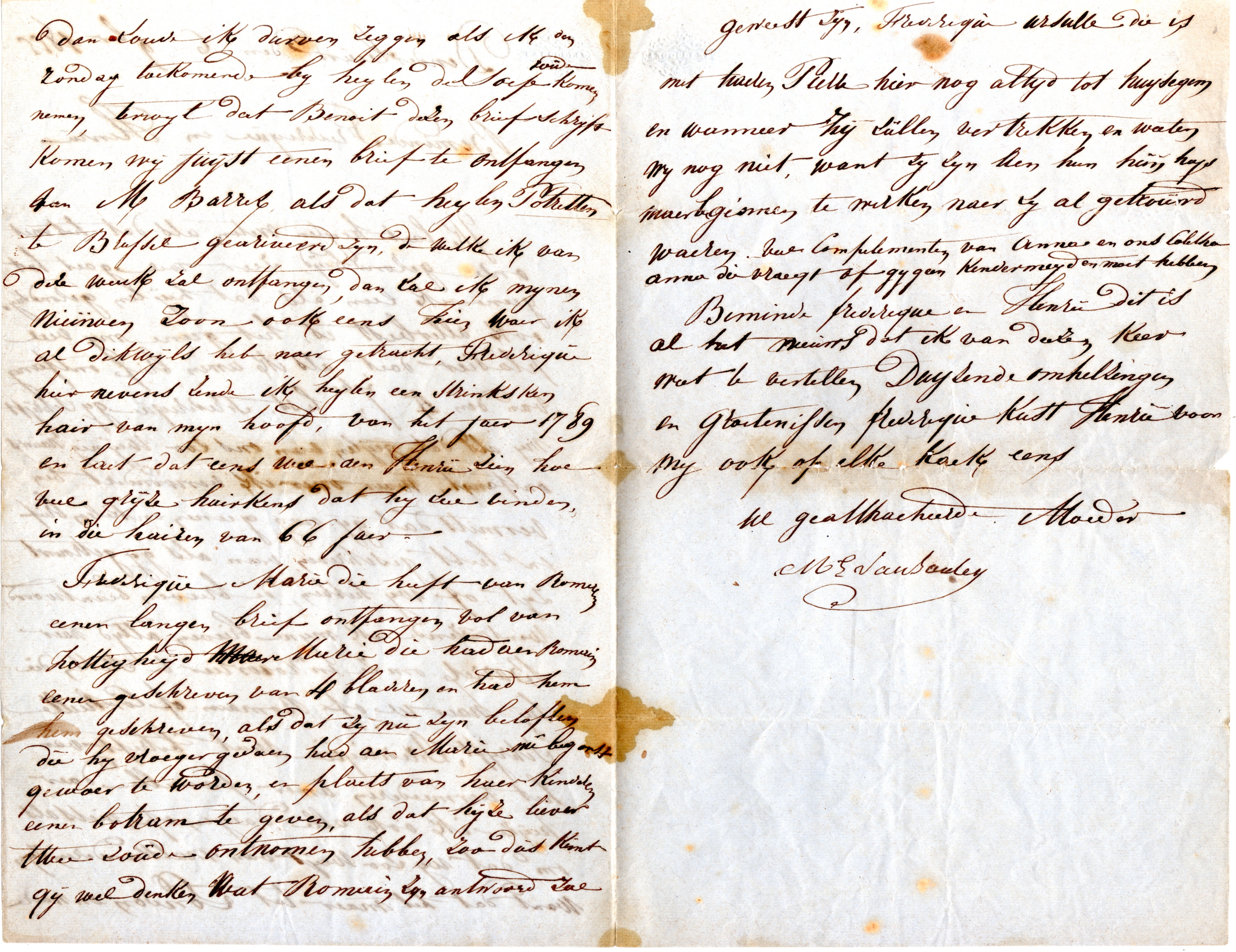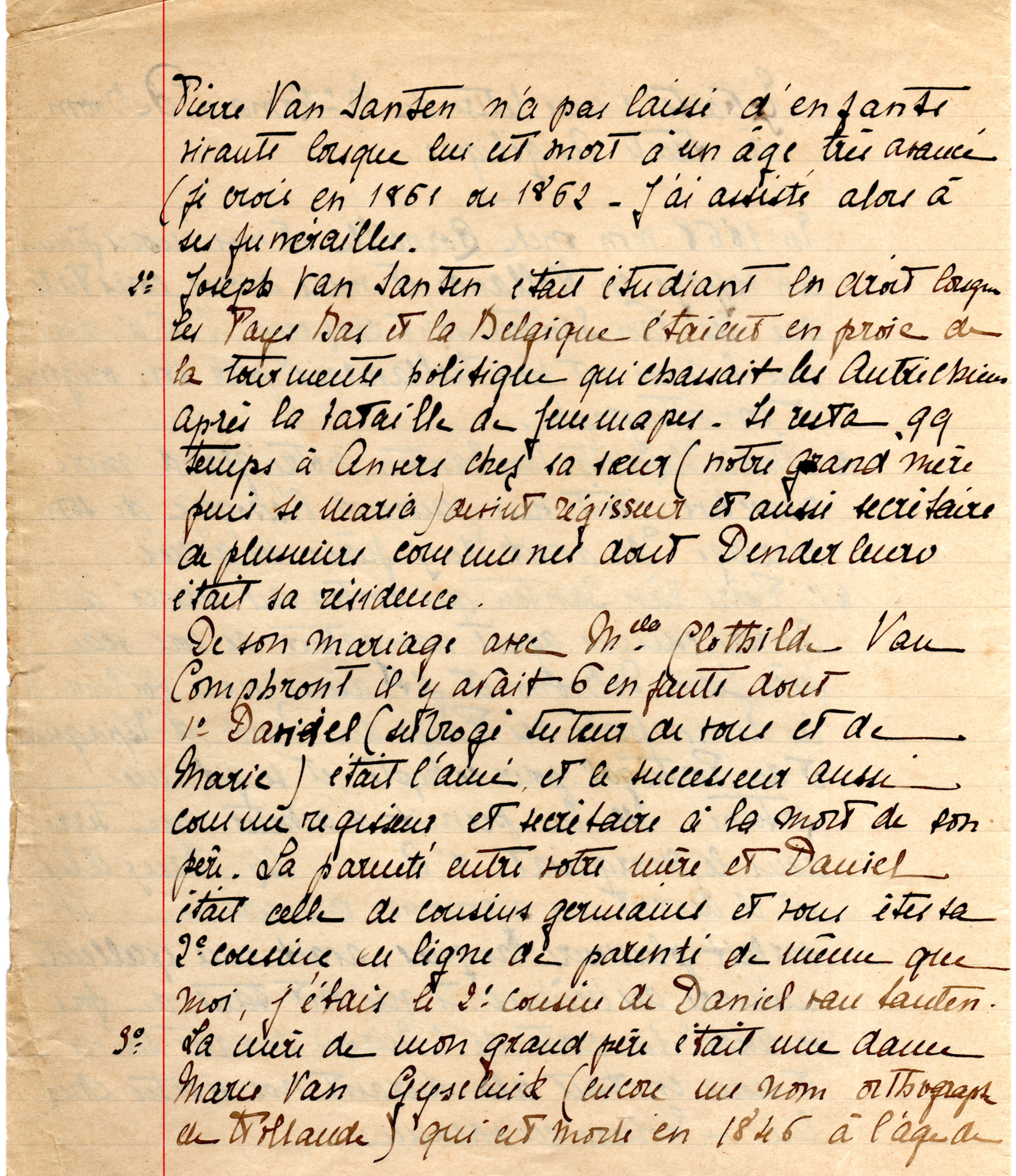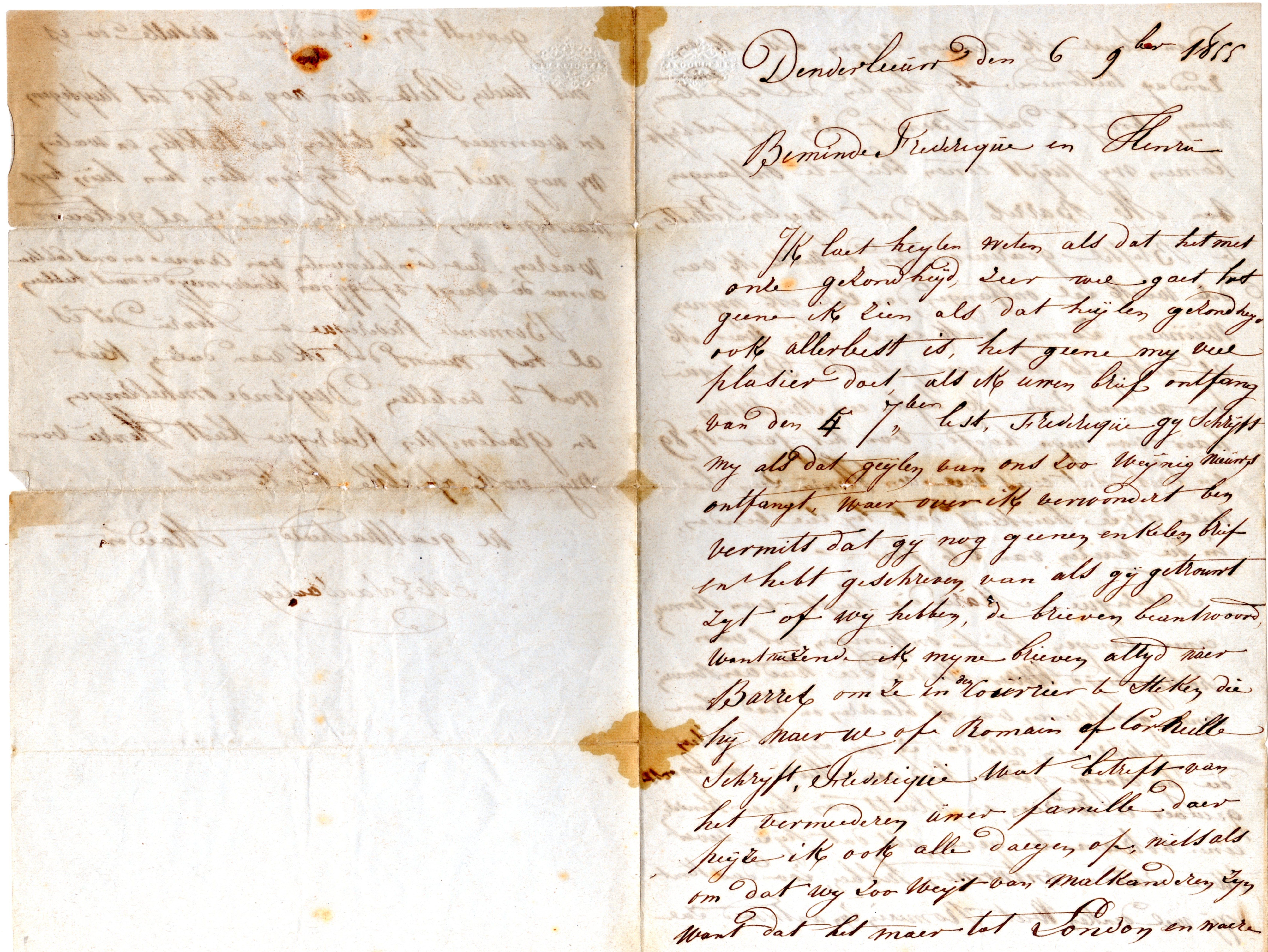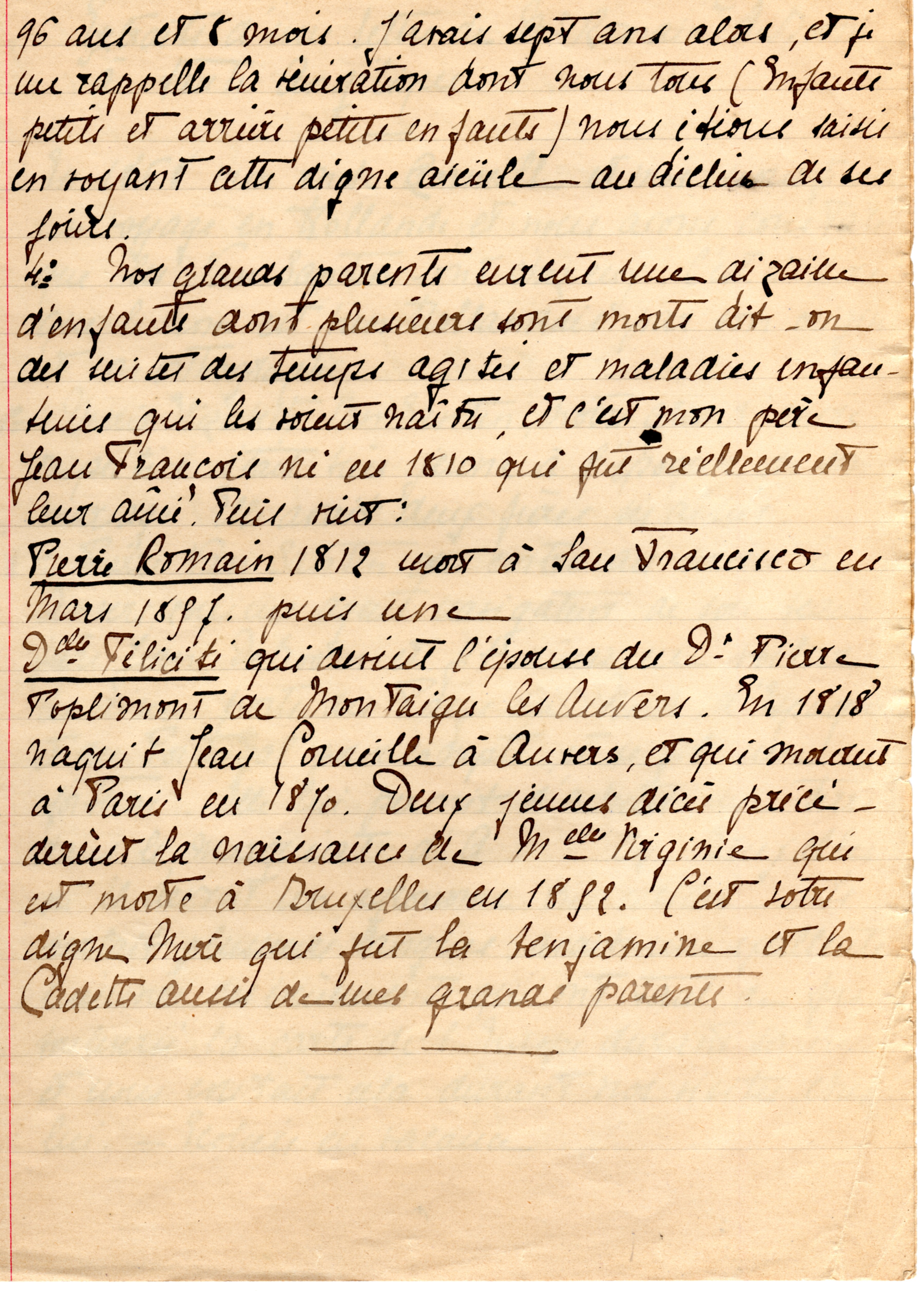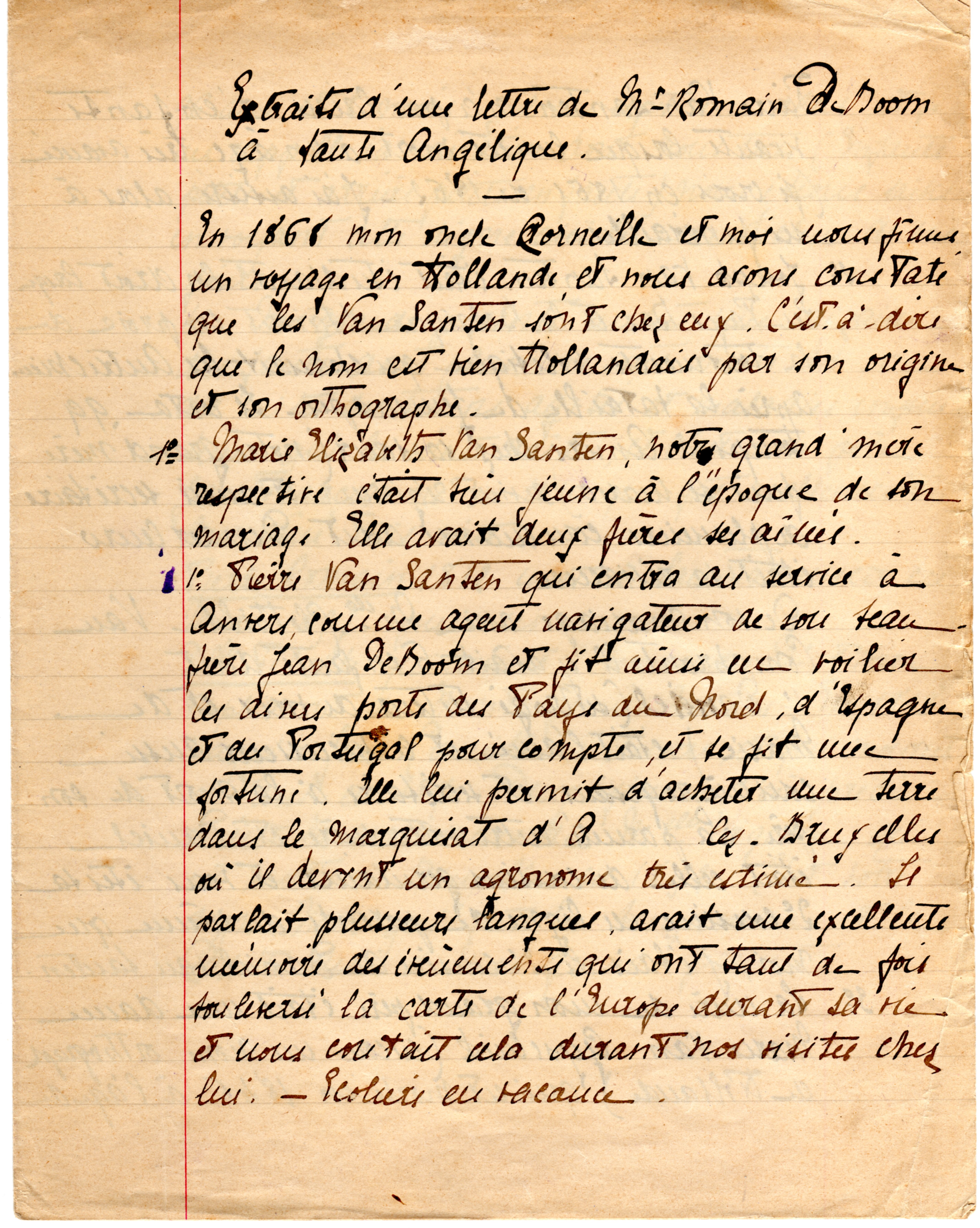 On November 6, 1855 Elisabeth van Santen wrote in Flemish to her daughter, Jeanne Frederique De Boom and her husband, Henri de Laurencel, living in San Francisco. Here is the Elisabeth Van Santen_letter 1855_French translation. Below are scans of the original document, along with an 1890 letter from RC De Boom (Emma’s father), extracts from a letter from RC De Boom his first cousin,to Angelique de Laurencel, a 1955 letter from Frederick De Boom Witzel (Emma’s oldest son) and one from Emma herself dated 1957.